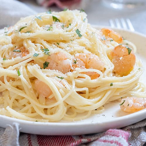 Fettuccini con suave salsa bechamel y camarones salteados al toque.
