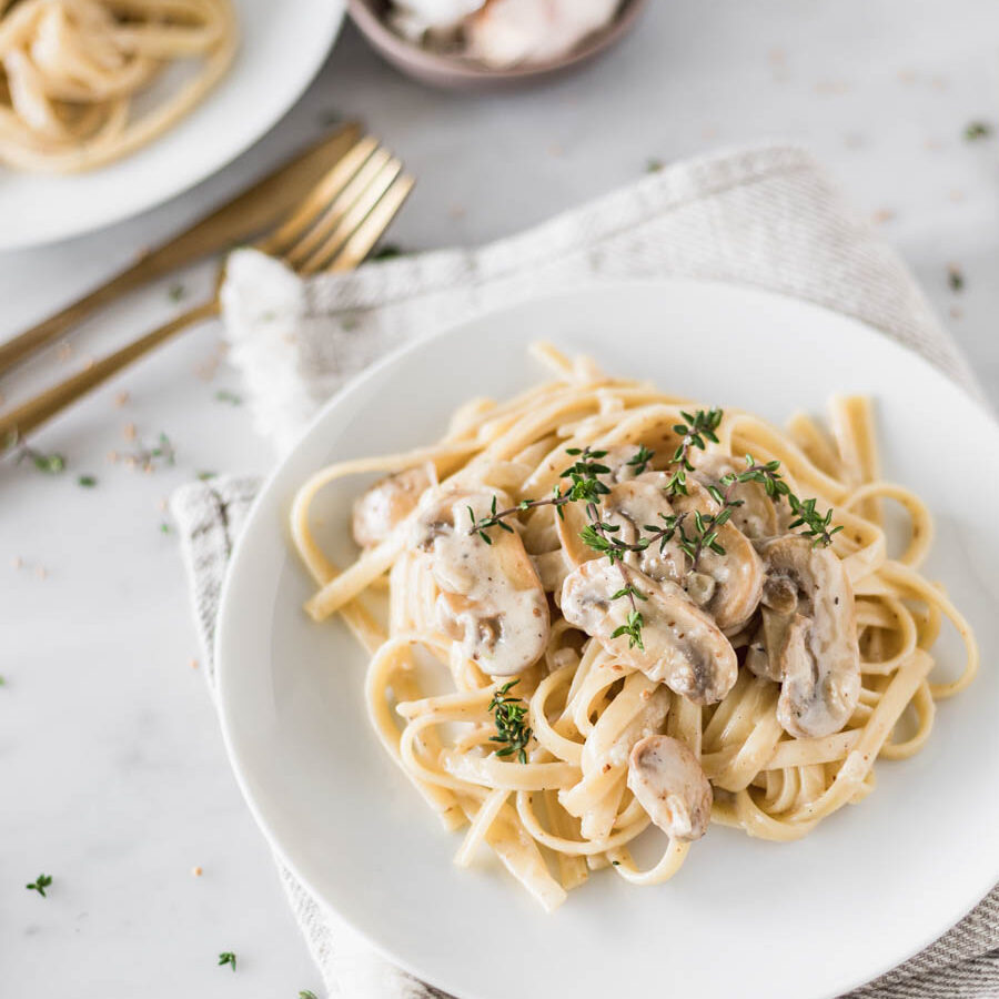 Fettuccini con cremosa salsa de champiñones salteados y toque de parmesano.
